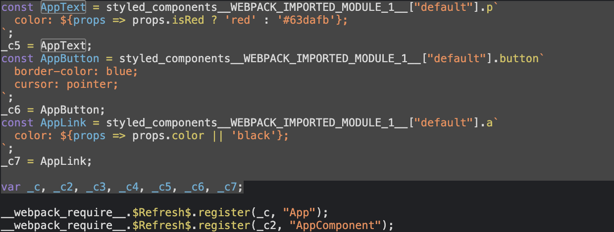 첫 화면에 필요한 CSS를 CSS-in-JS는 자바스크립트 파싱을 통해서 제공합니다. 그런데 필요하지 않은, 즉 인터렉션이 일어나지 않은 부분에 대해서는 생성을 하지 않습니다. 다음과 같은 예시가 있습니다. 위 사진에 있는 AppText는 첫 화면이 파란색입니다. 그래서 다음과 같은 DOM을 구성합니다.